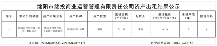 綿陽市綿投商業(yè)運營管理有限責任公司資產(chǎn)出租結(jié)果公示