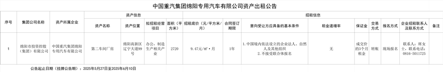 中國重汽集團綿陽專用汽車有限公司資產(chǎn)出租公告