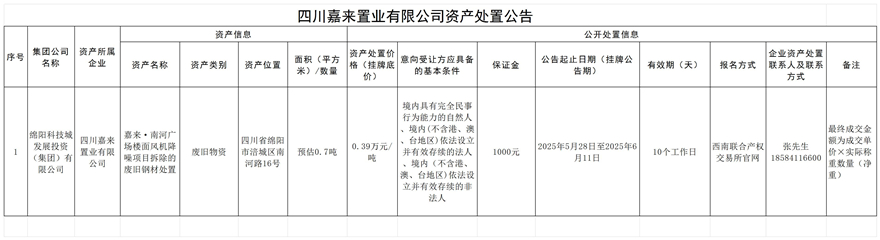 四川嘉來置業(yè)有限公司資產(chǎn)處置公告
