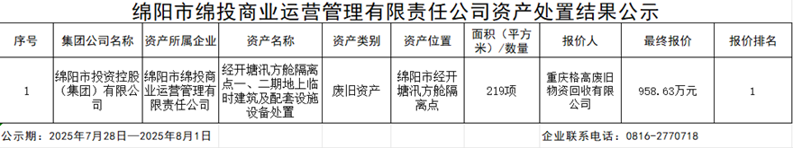 綿陽市綿投商業(yè)運營管理有限責(zé)任公司資產(chǎn)處置結(jié)果公示