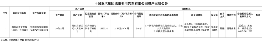 中國(guó)重汽集團(tuán)綿陽(yáng)專用汽車有限公司資產(chǎn)出租公告