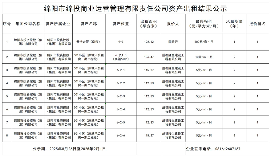 綿陽(yáng)市綿投商業(yè)運(yùn)營(yíng)管理有限責(zé)任公司資產(chǎn)出租結(jié)果公示