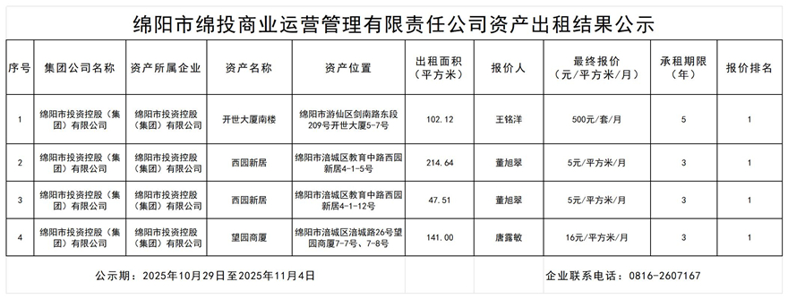 綿陽市綿投商業(yè)運營管理有限責(zé)任公司資產(chǎn)出租結(jié)果公示