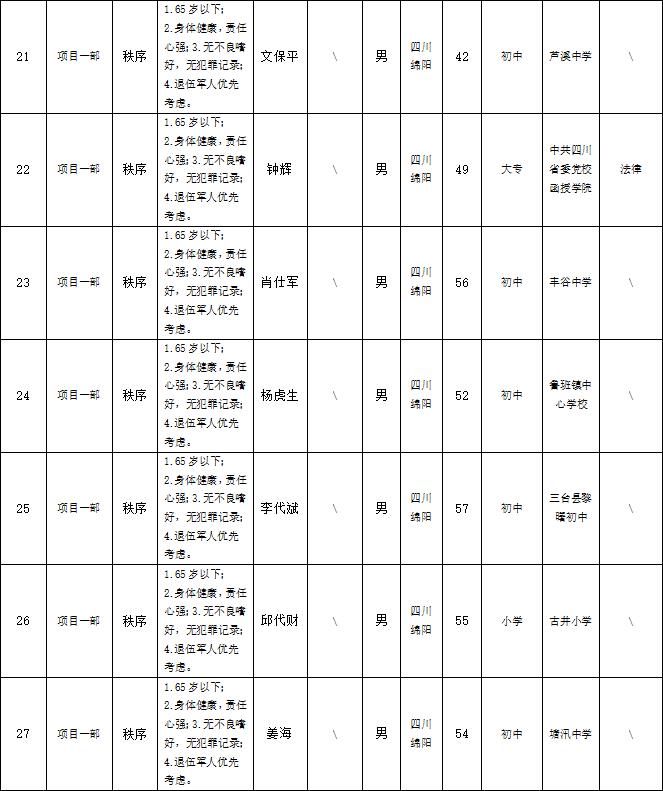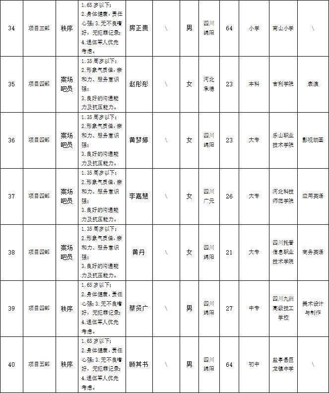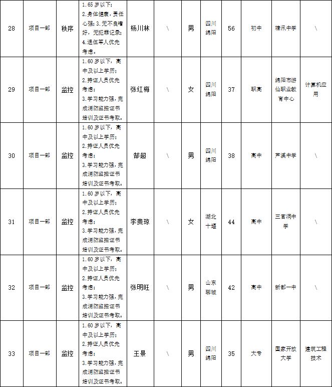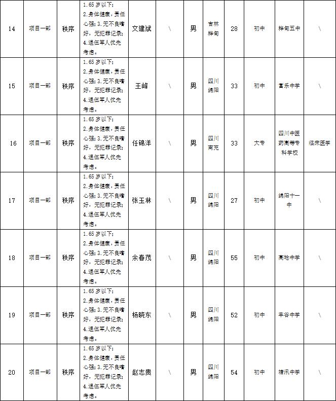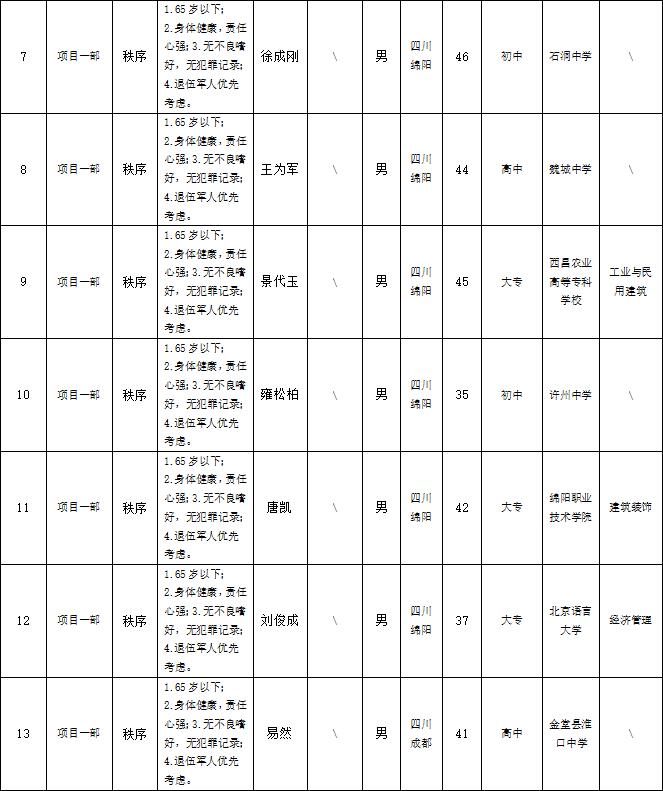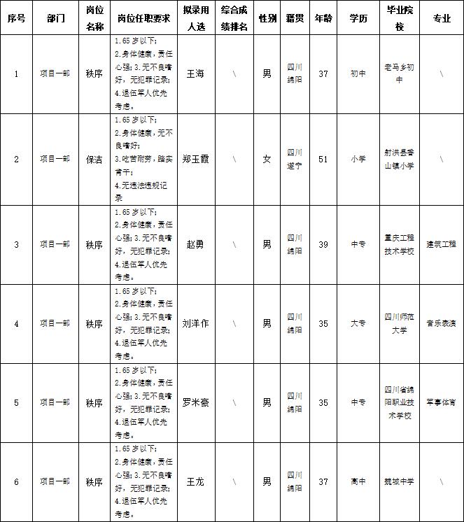 根據(jù)綿陽市康來物業(yè)服務有限公司發(fā)布的招聘公告及招聘相關規(guī)定,經(jīng)面試等程序,擬錄用以下人員到各項目部工作,現(xiàn)予以公示,具體情況如下: