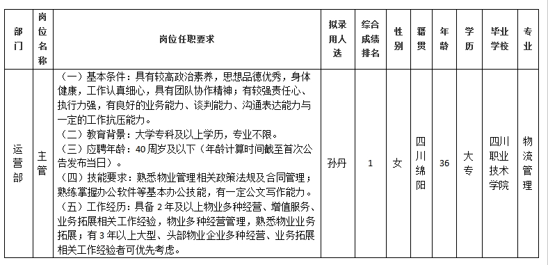 根據(jù)綿陽(yáng)市康來(lái)物業(yè)服務(wù)有限公司發(fā)布的招聘公告及招聘相關(guān)規(guī)定,經(jīng)筆試、面試、背景調(diào)查等程序,擬錄用孫丹同志到綿陽(yáng)市康來(lái)物業(yè)服務(wù)有限公司運(yùn)營(yíng)部工作,現(xiàn)予以公示,具體情況如下: