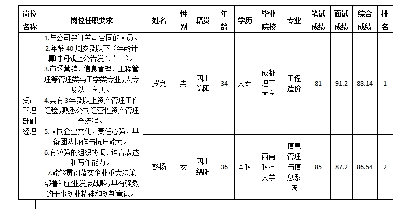 根據(jù)綿陽市綿投商業(yè)運營管理有限責(zé)任公司發(fā)布的競聘公告及競聘相關(guān)規(guī)定,經(jīng)筆試、面試等程序,現(xiàn)將筆試(面試)成績予以公示。