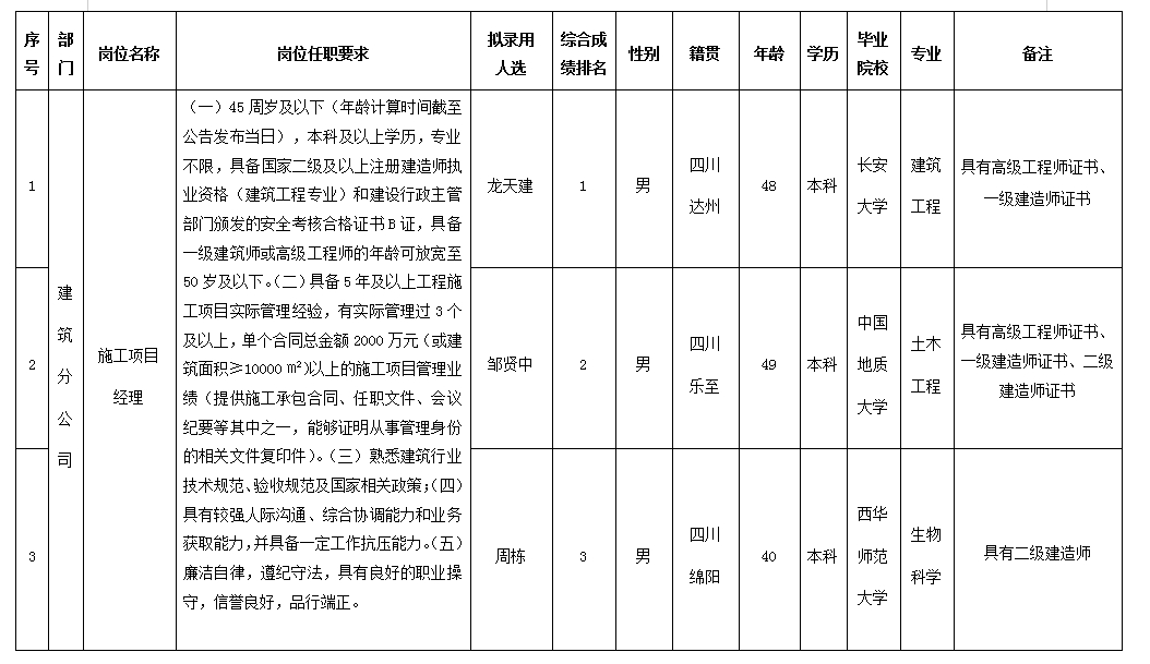 根據(jù)四川嘉來(lái)建筑工程有限公司發(fā)布的招聘公告及招聘相關(guān)規(guī)定,經(jīng)筆試、面試、考察、體檢等程序,擬錄用龍?zhí)旖?、鄒賢中、周棟同志到四川嘉來(lái)建筑工程有限公司工作,現(xiàn)予以公示,具體情況如下: