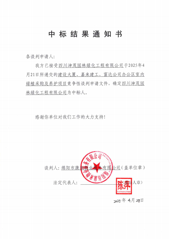 建設(shè)大廈、嘉來(lái)建工、富達(dá)公司辦公區(qū)室內(nèi)綠植采購(gòu)及養(yǎng)護(hù)項(xiàng)目中標(biāo)結(jié)果通知