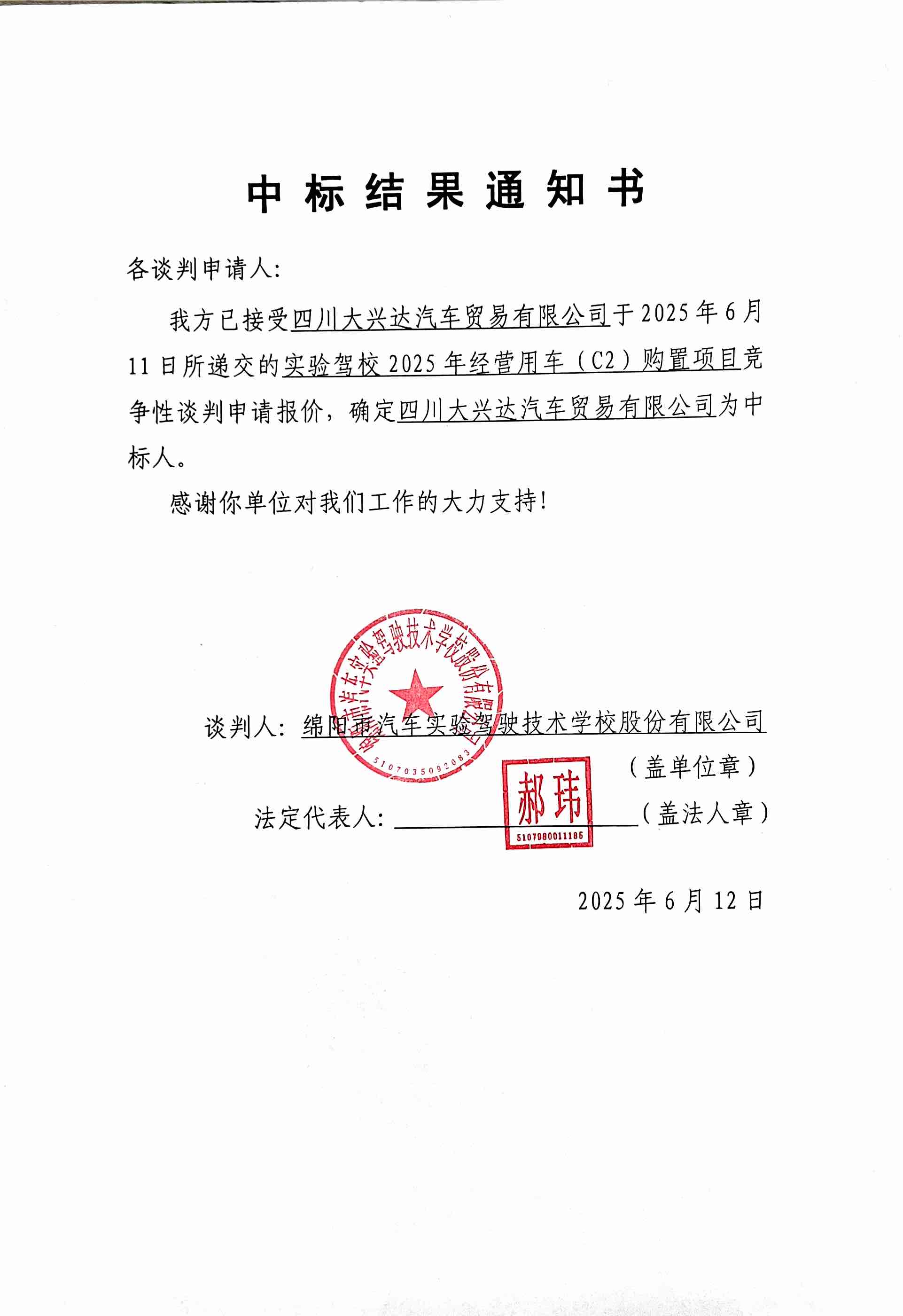 實(shí)驗(yàn)駕校2025年經(jīng)營用車(C2)購置項(xiàng)目中標(biāo)結(jié)果通知