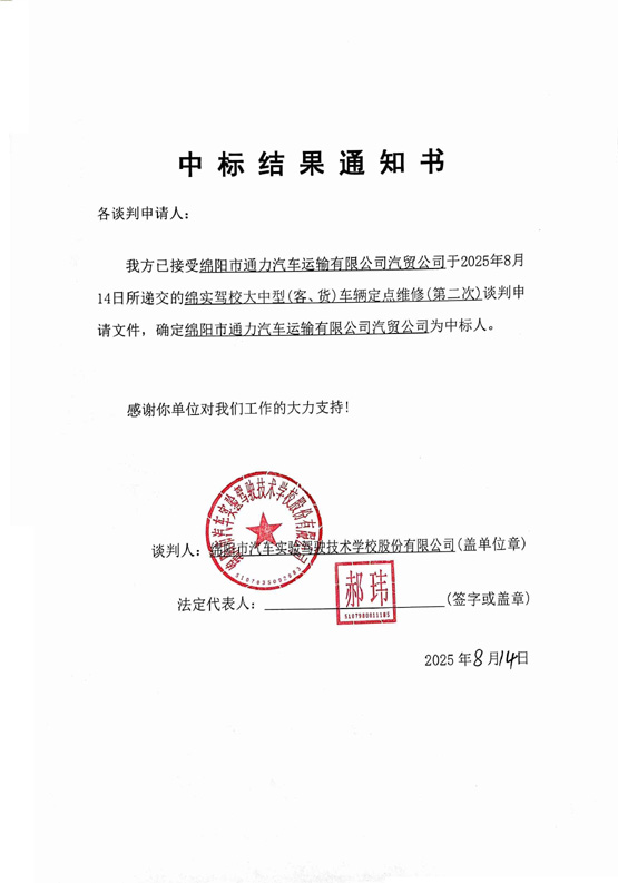 綿實駕校大中型(客、貨)車輛定點維修(第二次)中標結(jié)果通知
