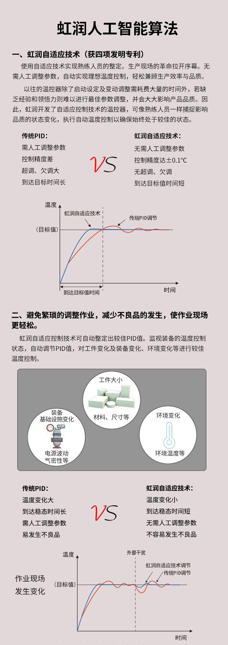 虹潤公司是專業(yè)生產(chǎn)溫控器的國家專精特新“小巨人”企業(yè)。生產(chǎn)的人工智能溫控器,具有真正人工智能算式,無需人工整定參數(shù),控制精度可達±0.1°C,多種輸出類型,高抗干擾等特點。產(chǎn)品獲得模糊PID控制儀及控制方法、人工智能調(diào)節(jié)器、智能化控制器、移相觸發(fā)控制器、閥門自動手動無擾動操作控制方法及裝置等5項國家發(fā)明專利,主持起草工業(yè)過程控制系統(tǒng)用模擬輸入兩位或多位輸出儀表、物聯(lián)網(wǎng)智能溫度儀表通用技術(shù)條件、工業(yè)過程測量和控制系統(tǒng)用智能調(diào)節(jié)器等3項國家標準,以及通信系統(tǒng)多通道數(shù)據(jù)采集控制終端規(guī)范軍用標準,參與國際5G標準制定,取得模糊PID溫控儀等3項相關(guān)軟件著作權(quán)。產(chǎn)品廣泛應用于電力、石化,冶金、制藥、食品等幾乎所有工業(yè)現(xiàn)場,實現(xiàn)精準控溫,保障生產(chǎn)安全與質(zhì)量。