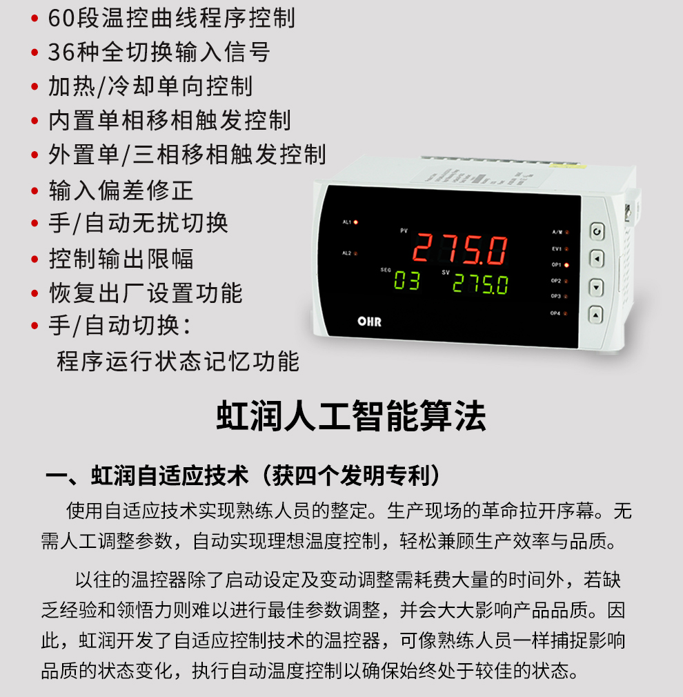 虹潤公司是專業(yè)生產(chǎn)溫控器的國家專精特新“小巨人”企業(yè)。生產(chǎn)的程序段智能溫控器,具有真正人工智能算式,無需人工整定參數(shù),控制精度可達±0.1°C,60段溫控曲線程序,無超調(diào)、欠調(diào)等特點。產(chǎn)品獲得模糊PID控制儀及控制方法、人工智能調(diào)節(jié)器、智能化控制器、移相觸發(fā)控制器、閥門自動手動無擾動操作控制方法及裝置等5項國家發(fā)明專利,主持起草智能溫度儀表通用技術(shù)條件、工業(yè)過程控制系統(tǒng)用模擬輸入兩位或多位輸出儀表、工業(yè)過程測量和控制系統(tǒng)用智能調(diào)節(jié)器等3項國家標準,,以及通信系統(tǒng)多通道數(shù)據(jù)采集控制終端規(guī)范軍用標準,參與國際5G標準制定,取得60段PID自整定調(diào)節(jié)器等3項相關軟件著作權(quán)。產(chǎn)品廣泛應用于電力、石化,冶金、制藥、食品等幾乎所有工業(yè)現(xiàn)場,實現(xiàn)精準控溫,保障生產(chǎn)安全與質(zhì)量。