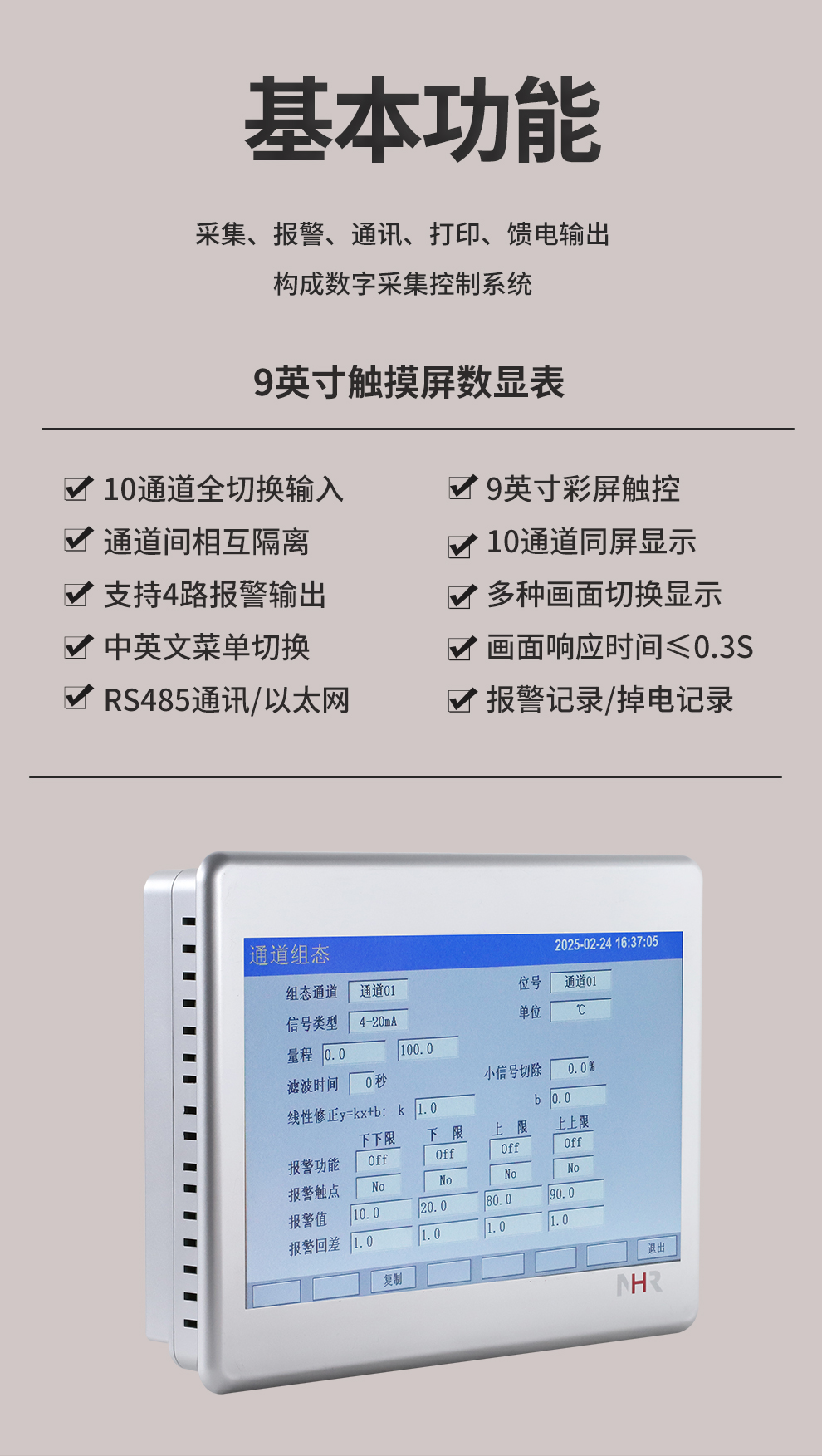 虹潤(rùn)公司是專業(yè)生產(chǎn)無(wú)紙記錄儀的國(guó)家專精特新“小巨人”企業(yè)。生產(chǎn)的觸摸屏數(shù)顯表,具有觸摸大屏顯示,多通道全切換輸入,通道間隔離,RS485/以太網(wǎng)通訊,5/7/9英寸可選等特點(diǎn)。產(chǎn)品獲得無(wú)紙記錄儀、數(shù)據(jù)采集控制工作站、智能化控制器、巡回檢測(cè)顯示方法及裝置等4項(xiàng)國(guó)家發(fā)明專利,主持起草物聯(lián)網(wǎng)智能記錄儀表通用技術(shù)條件、物聯(lián)網(wǎng)智能溫度儀表通用技術(shù)條件等2項(xiàng)國(guó)家標(biāo)準(zhǔn),通信系統(tǒng)多通道數(shù)據(jù)采集控制終端規(guī)范軍用標(biāo)準(zhǔn),以及空間數(shù)據(jù)與信息數(shù)據(jù)傳輸系統(tǒng)等2項(xiàng)航天標(biāo)準(zhǔn),參與國(guó)際5G標(biāo)準(zhǔn)制定,取得觸摸屏彩色無(wú)紙記錄儀等4項(xiàng)相關(guān)軟件著作權(quán)。產(chǎn)品廣泛應(yīng)用于冶金、石化、電力、制藥、新能源、現(xiàn)代農(nóng)業(yè)生產(chǎn)過(guò)程等諸多領(lǐng)域。