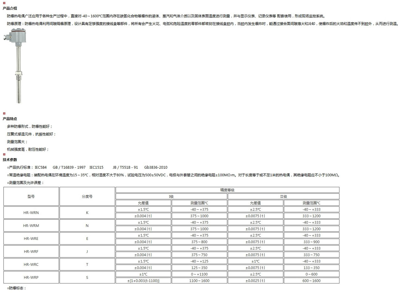 隔爆熱電偶是一種溫度傳感器,在化學工業(yè)自控系統(tǒng)中應用極廣,通過溫度傳感器,可將控制對象的溫度參數(shù)變成電信號,傳遞給顯示、記錄和調(diào)節(jié)儀,對系統(tǒng)施行檢測、調(diào)節(jié)和控制。在化工廠,生產(chǎn)現(xiàn)場常伴有各種易燃、易爆等 化學氣體、蒸汽,如果使用普通的熱電偶非常不安全,極易引起環(huán)境氣體爆炸。