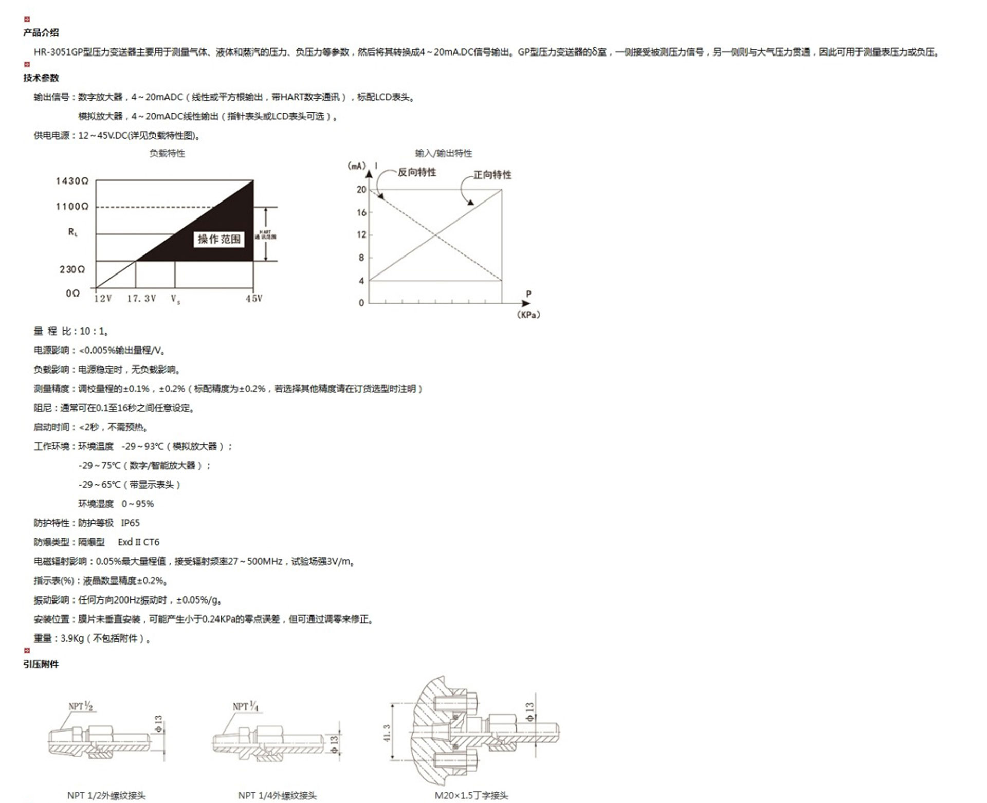 HR-3051GP型壓力變送器主要用于測量氣體、液體和蒸汽的壓力、負壓力等參數(shù),然后將其轉換成4~20mA.DC信號輸出。GP型壓力變送器的δ室,一側接受被測壓力信號,另一側則與大氣壓力貫通,因此可用于測量表壓力或負壓。