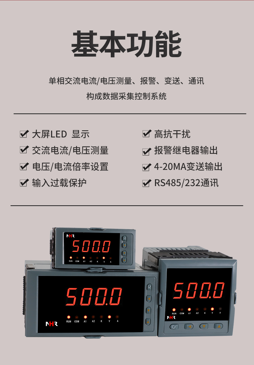 虹潤公司是專業(yè)生產(chǎn)數(shù)字電壓表的國家專精特新“小巨人”企業(yè),生產(chǎn)的交流電壓/電流表,具有大屏LED顯示,電流電壓倍率設(shè)置,高抗干擾,輸出過載保護(hù),RS485/RS232通訊等特點(diǎn)。產(chǎn)品獲得一種交流信號變送器、交直流信號轉(zhuǎn)換電路、基于DCS技術(shù)的盤裝式三相電量表等3項國家發(fā)明專利,主持起草工業(yè)過程控制系統(tǒng)用模擬輸入兩位或多位輸出儀表國家標(biāo)準(zhǔn),直流漏電流傳感器規(guī)范、通信系統(tǒng)多通道數(shù)據(jù)采集控制終端規(guī)范等2項軍用標(biāo)準(zhǔn),以及現(xiàn)場設(shè)備集成等5項智能制造國家標(biāo)準(zhǔn),參與國際5G標(biāo)準(zhǔn)制定。取得單相電量儀表等2項相關(guān)軟件著作權(quán)。產(chǎn)品廣泛應(yīng)用于工業(yè)制造、建筑地產(chǎn)、機(jī)電設(shè)備、能源電力、市政設(shè)施 、數(shù)據(jù)中心與通信等諸多領(lǐng)域。