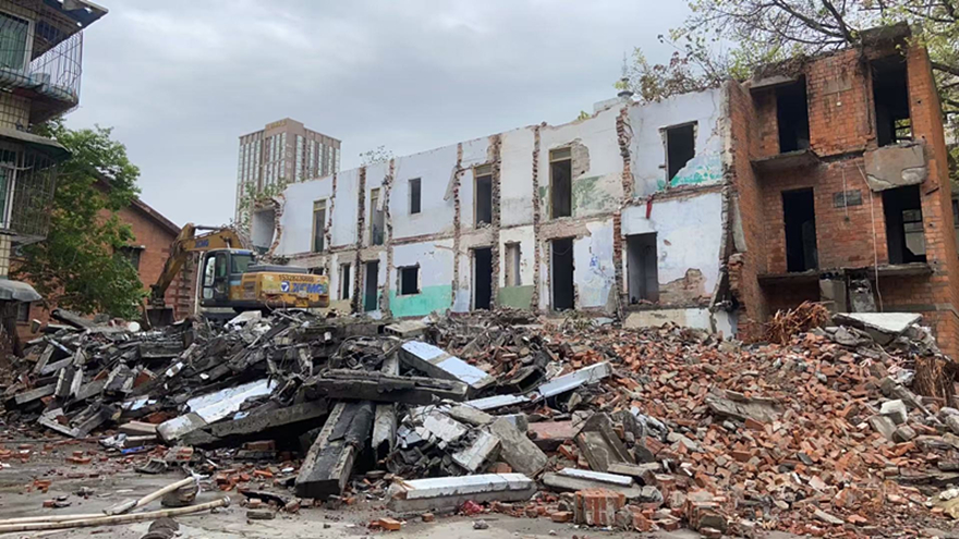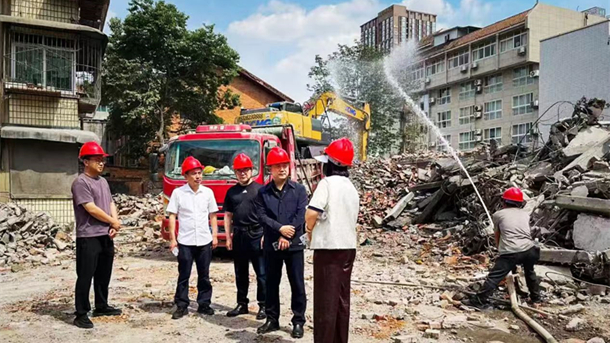 危房緊鄰周邊住宅,施工空間狹小,拆除難度極大。為確保拆除工作安全有序進(jìn)行,富達(dá)公司多次組織建筑、安全專家現(xiàn)場勘查,研究制定了“機械拆除為主,人工配合為輔”的精細(xì)化拆除方案。拆除現(xiàn)場,工作人員設(shè)置警戒線封鎖拆除區(qū)域,專人疏導(dǎo)圍觀群眾,維護(hù)現(xiàn)場秩序。伴隨著挖掘機的轟鳴聲,危房樓體結(jié)構(gòu)在專業(yè)人員的精準(zhǔn)操控下逐步瓦解,同步實施灑水降塵措施,整個拆除過程安全、有序、環(huán)保。